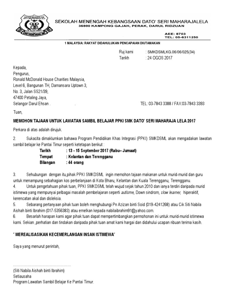 By Posted on September 10 2020. Jika anda tidak mahir menulis surat formal dapatkan bantuan daripada mereka yang pakar seperti guru-guru atau rujuk kepada contoh-contoh surat formal dalam buku atau Internet. Contoh surat mohon sumbangan penajaan lawatan sambil belajar 1.