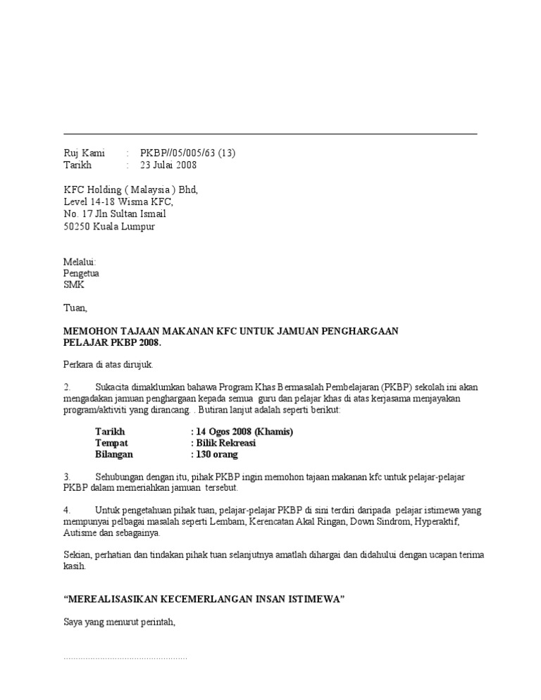 Maksudnya ini maklumat utama yang perlu dipastukan ada di dalam setiap permohonan. Contoh surat jemputan penceramah. Surat Permohonan Tajaan MILO 2016 Copy.
